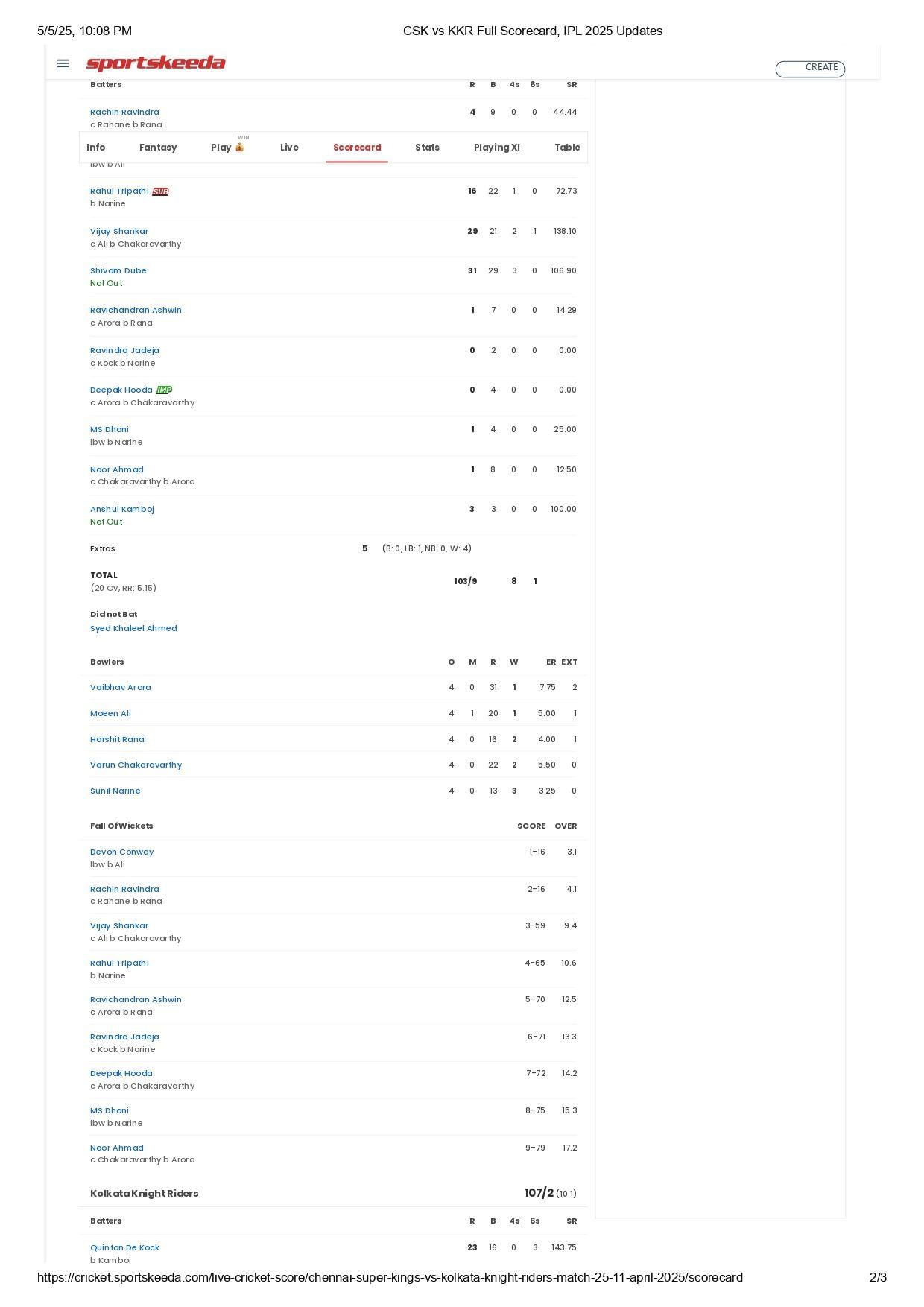 In response, the Kolkata-based franchise achieved the target with 9.5 overs in hand. Sunil Narine smashed a quickfire 44 off 18 balls, while Quinton de Kock, skipper Ajinkya Rahane, and Rinku Singh chipped in with 23 (16), 20* (17), and 15* (12), respectively. Meanwhile, Noor Ahmad and Anshul Kamboj shared one wicket each for CSK.