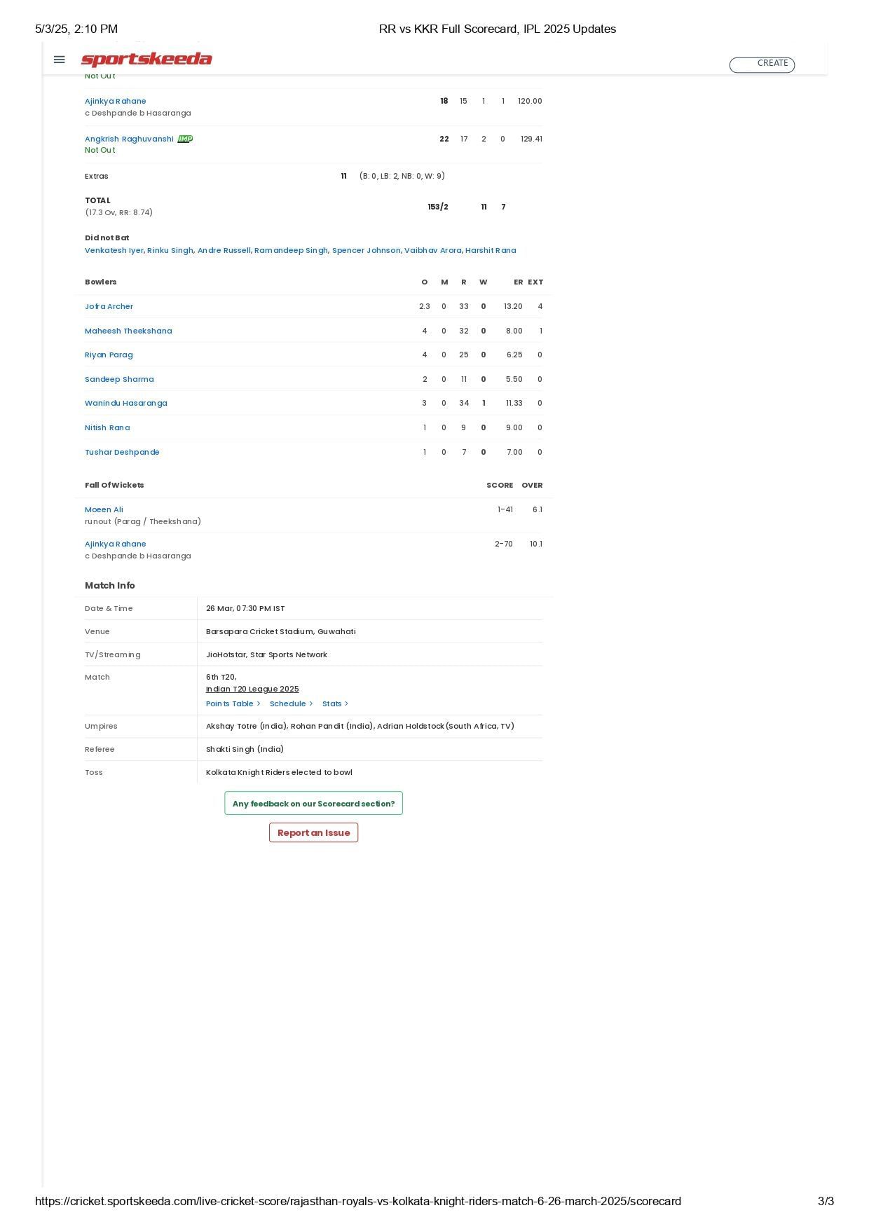 In response, the Kolkata-based franchise achieved the target with 2.3 overs in hand. Quinton de Kock starred with the bat, smashing an unbeaten 97 off 61 balls with the help of six maximums and eight boundaries. Meanwhile, Angkrish Raghuvanshi and skipper Ajinkya Rahane chipped in with 22 (17) and 18 (15), respectively. Meanwhile, Wanindu Hasaranga bagged the only wickets for the Royals.