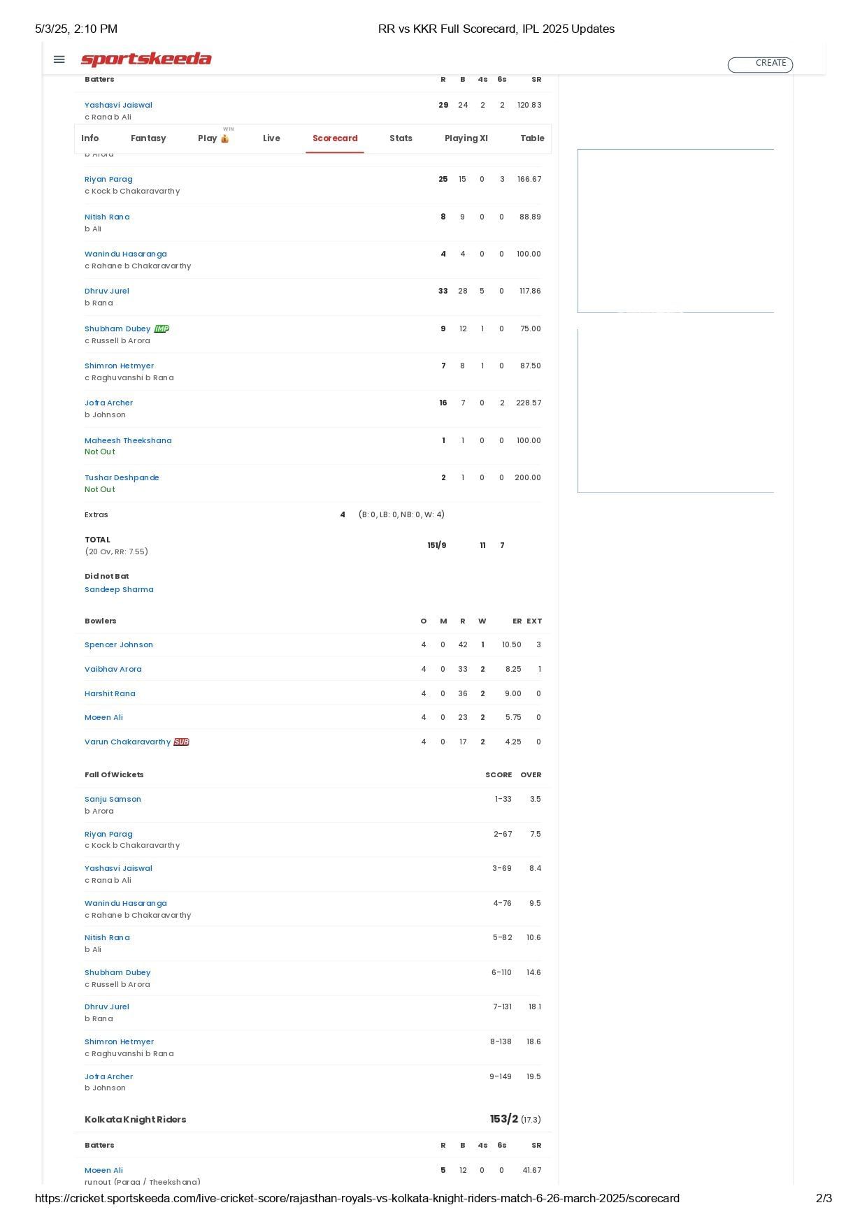 Invited to bat first, RR managed 151/9 in their allotted 20 overs. Yashasvi Jaiswal and Riyan Parag chipped in with 29 (24) and 25 (15), respectively. Later, Dhruv Jurel and Jofra Archer smashed 33 (28) and 16 (7), respectively.