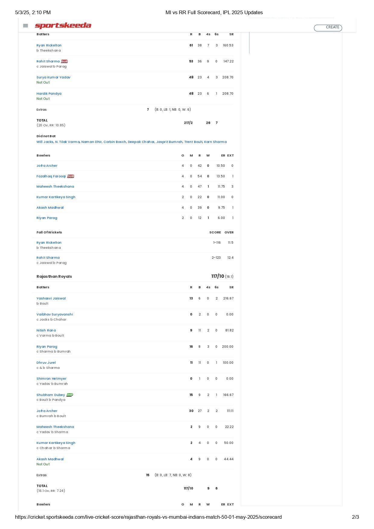 Batting first, Mumbai put up 217/2. Openers Ryan Rickelton and Rohit Sharma chipped in with 61 (38) and 53 (36), respectively. The duo put on a 116-run partnership for the opening stand. Meanwhile, Suryakumar Yadav and captain Hardik Pandya returned with identical unbeaten scores of 48 (23).