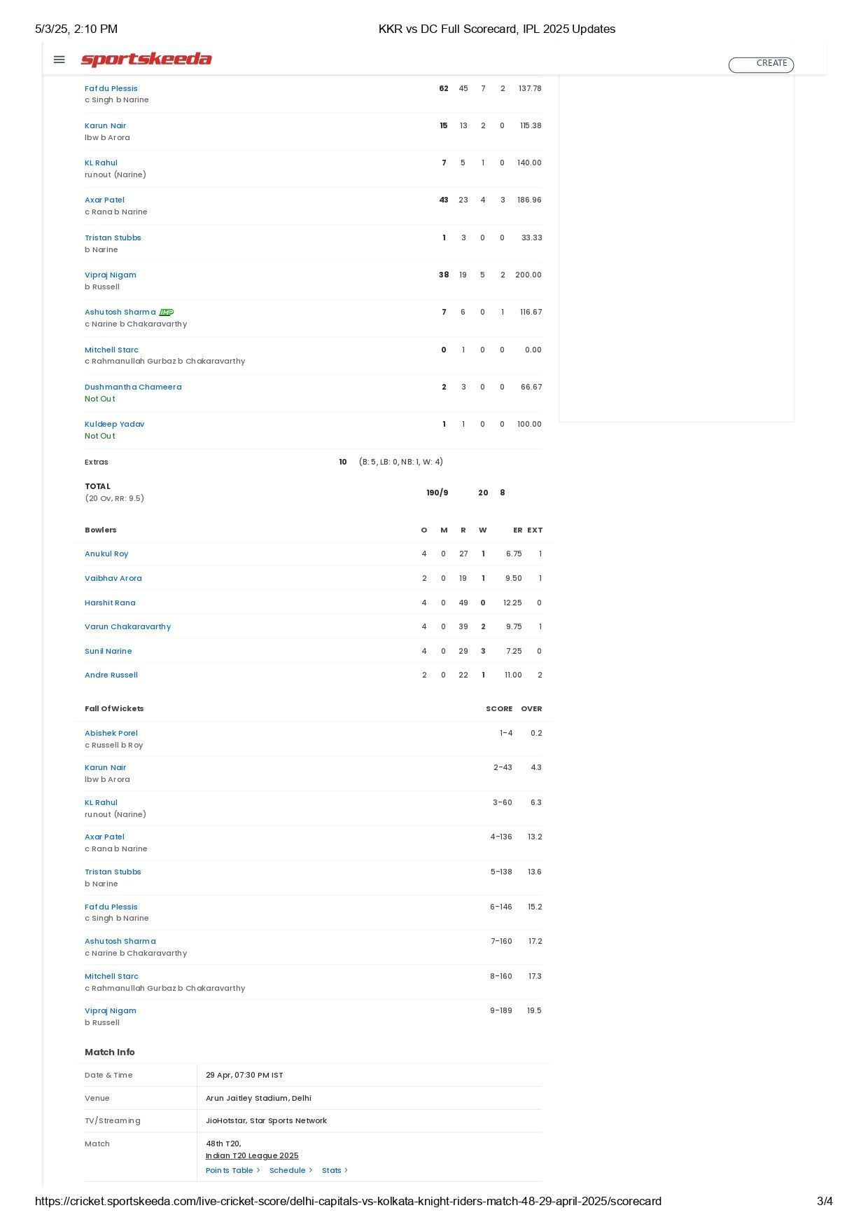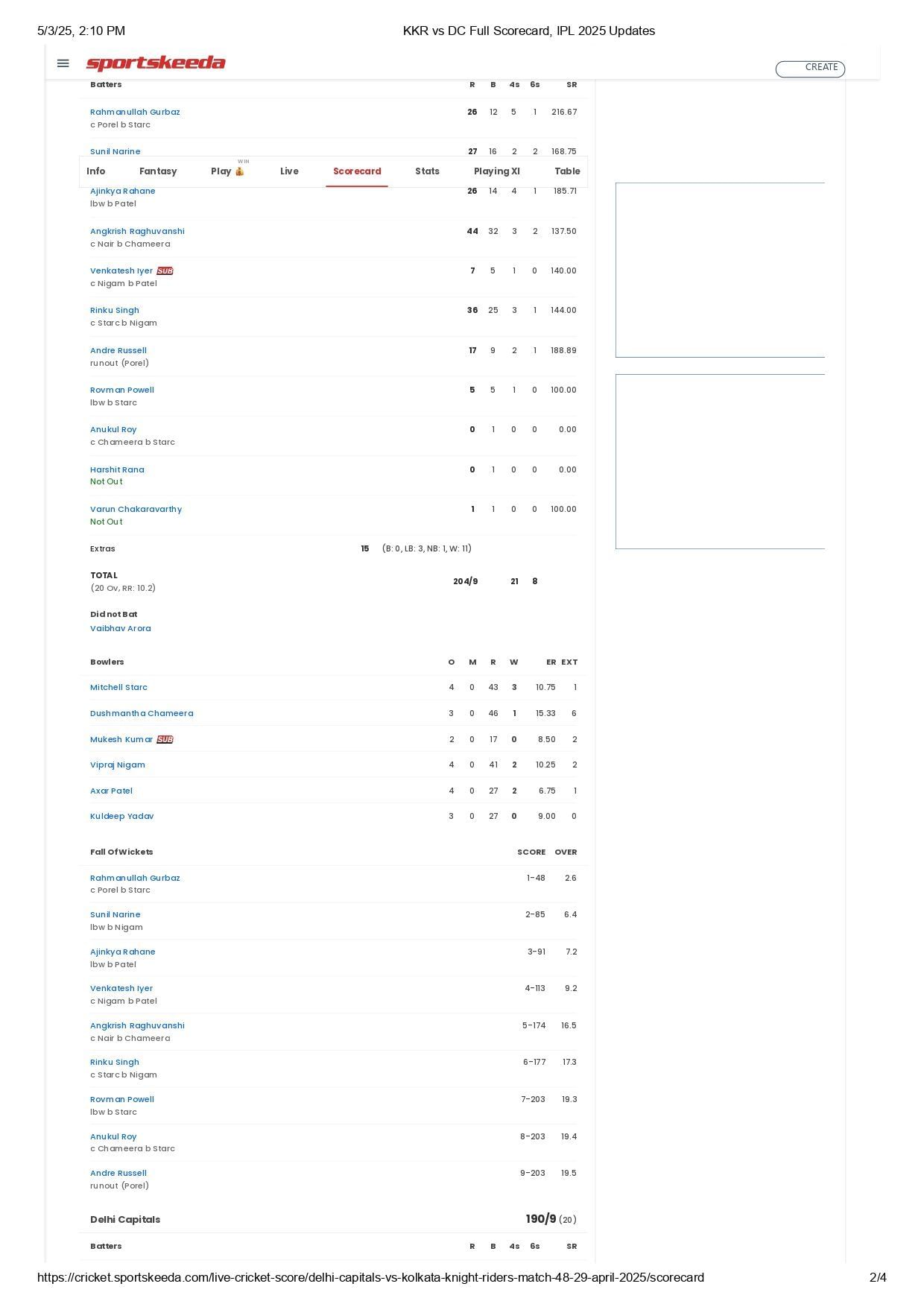 Sunil Narine was the pick of the bowlers for KKR, finishing with figures of 3/29, while Varun Chakaravarthy bagged two wickets. Andre Russell, Anukul Roy and Vaibhav Arora shared one wicket apiece.