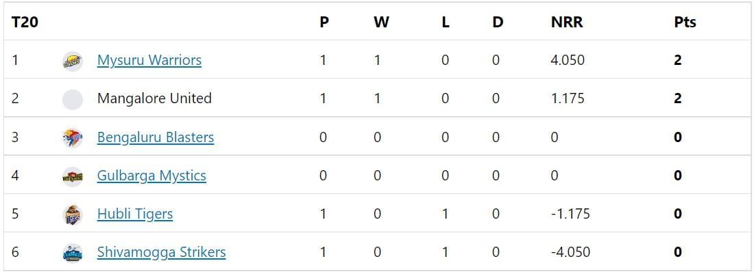 Mangalore United kicked off the campaign on a winning note, with plenty to ponder for Hubli Tigers. Mangalore, with a net run-rate of +1.175, briefly topped the table with two points before Mysuru Warriors dethroned them with a 69-run win over the Shivamogga Strikers and a net run-rate of +4.050.
