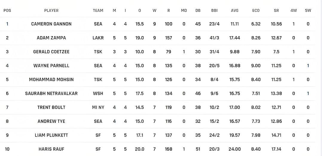 MLC 2023 most wickets list - Cameron Gannon emerges as the finest bowler so far