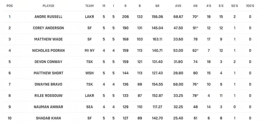 The Jamaican all-rounder Andre Russell continues to lead the runs chart after the conclusion of match 14. As of now, Russell has amassed 206 runs in five matches at a remarkable average of 68.67. He has smashed 19 fours and 15 sixes and achieved his best individual score of 70* in this tournament.