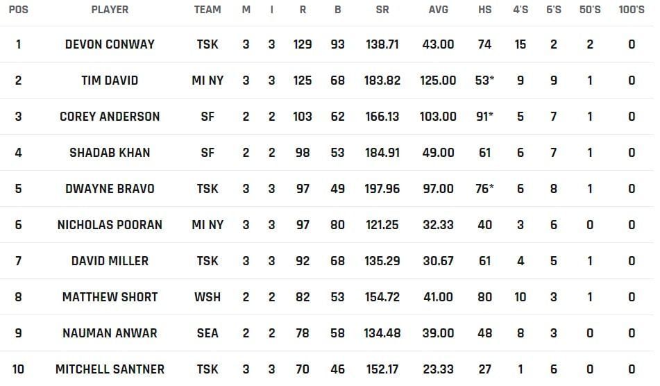Following the conclusion of today’s game, Devon Conway moves to the top and displaces Corey Anderson. He now has 129 runs in three games averaging 43 while having a strike rate of 138. He has so far scored two fifties in this tournament.