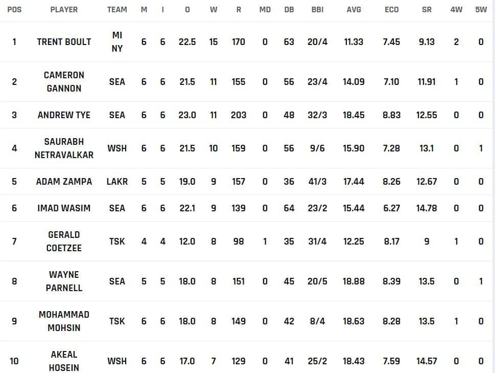 Saurabh Netravalkar leaps forward to claim the fourth position in the wickets column. His 6/9 are the best bowling figures by any bowler in the short history of the MLC. He has claimed 10 wickets in this tournament at a remarkable average of 15.9. He will take no further part in the tournament as Washington has officially been eliminated from the tournament.