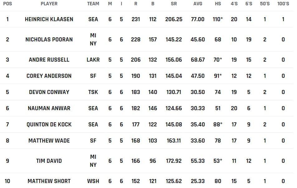 Heinrich Klaasen stays at the top with 231 runs under his belt averaging 77 while his strike rate is at a lethal high of 206.25. The South African batting stalwart has smashed a century and a half-century score in this tournament so far.