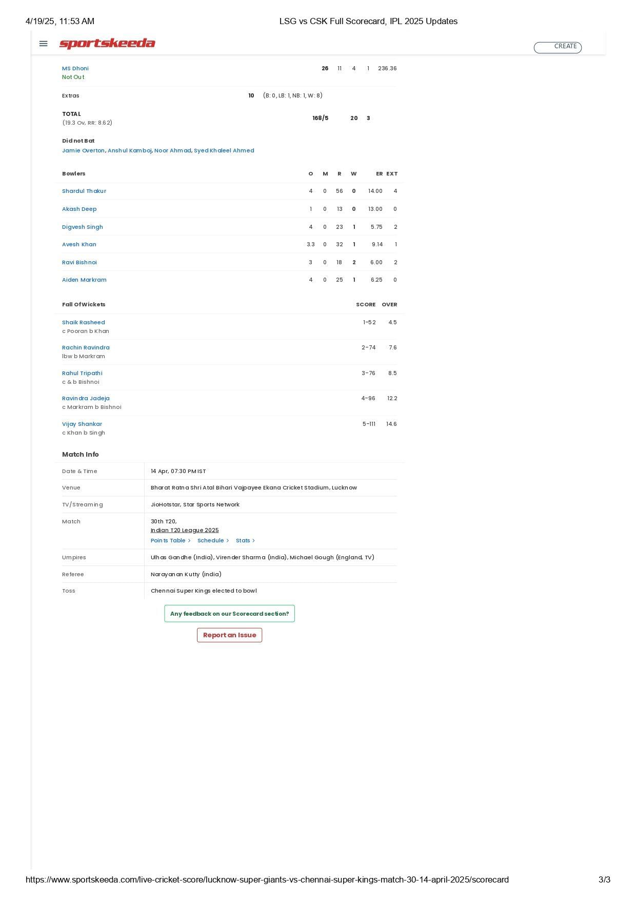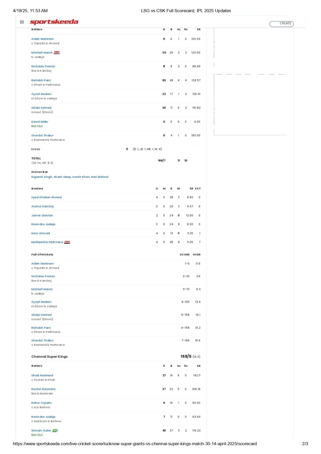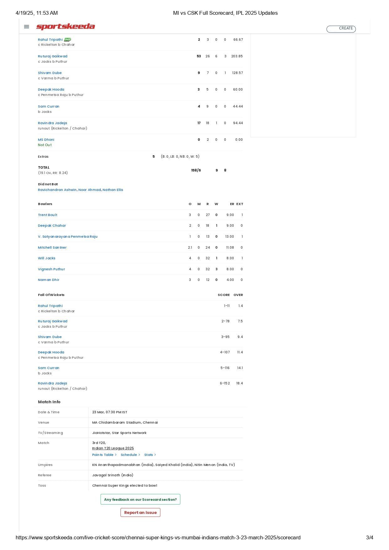 Noor Ahmad starred with the ball for CSK, finishing with figures of 4/18, while Khaleel Ahmed bagged three wickets. Nathan Ellis and Ravichandran Ashwin also chipped in with one wicket apiece.