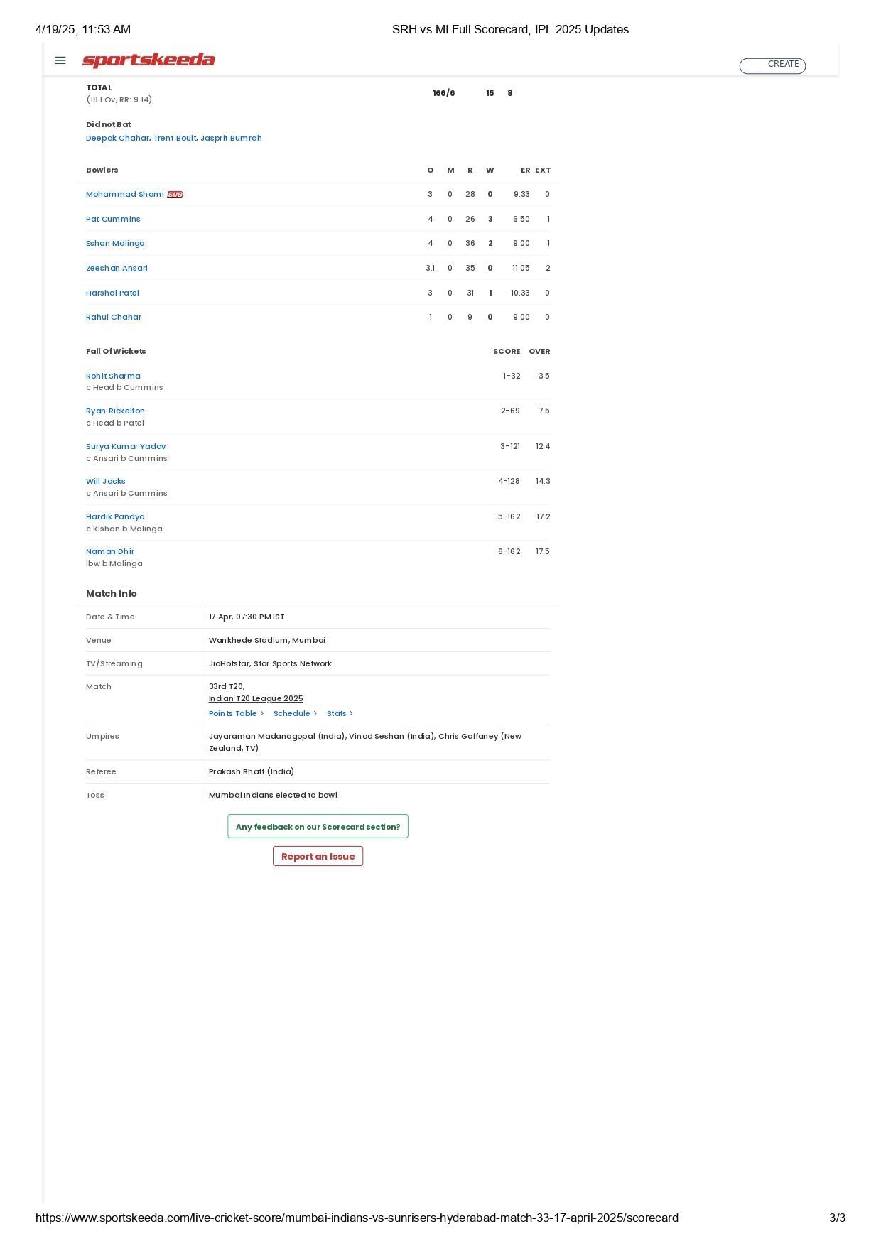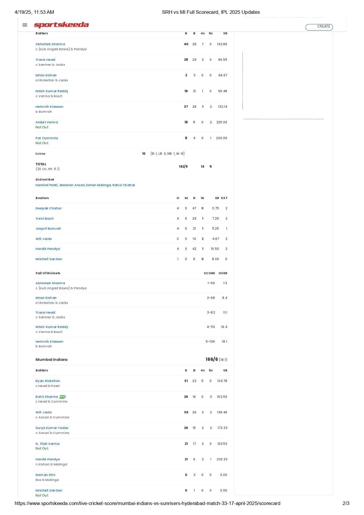 After choosing to bowl first, Mumbai restricted SunRisers to 162/5 in 20 overs. Openers Abhishek Sharma and Travis Head chipped in with scores of 40 (28) and 28 (29), respectively. Nitish Reddy, Heinrich Klaasen and Aniket Verma chipped in with 19 (21), 37 (28) and 18* (8), respectively.