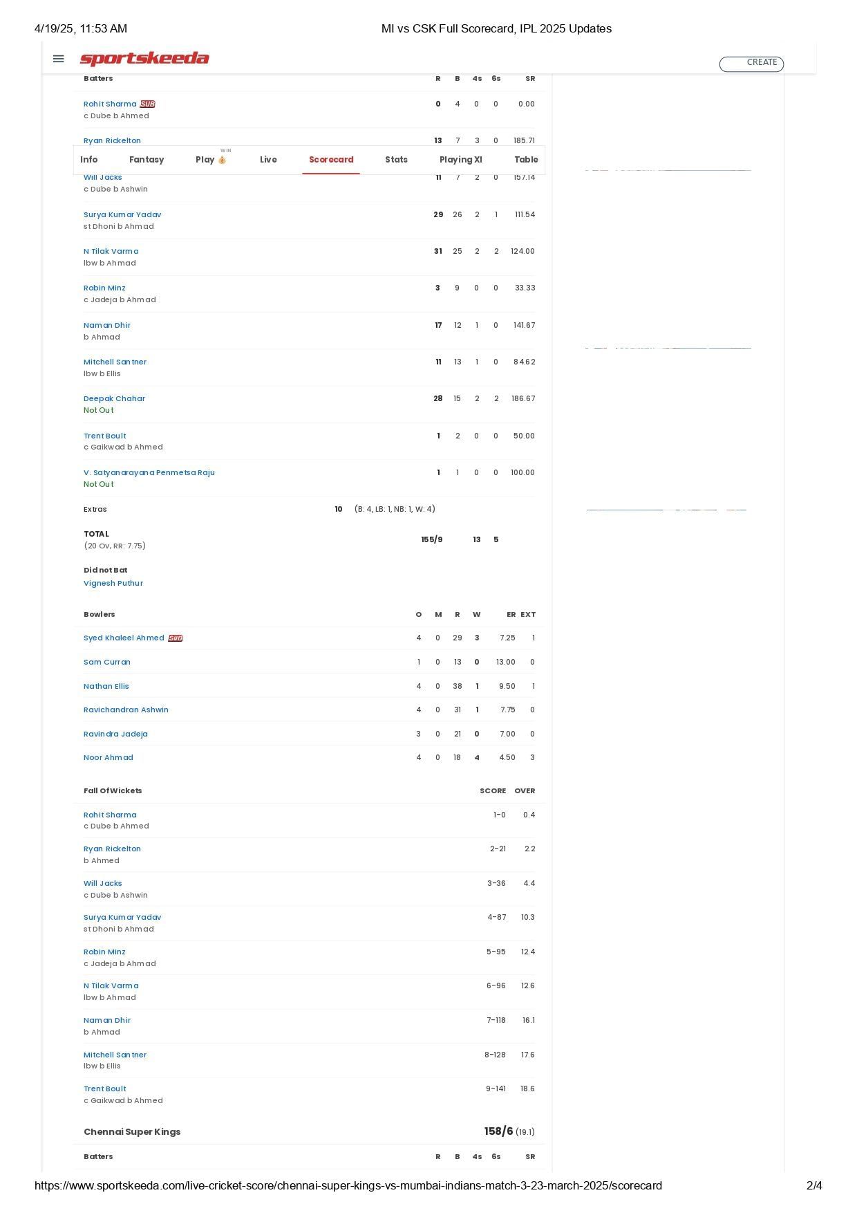 Invited to bat first, MI put up 155/9 in their allotted 20 overs. The top three faltered, but Suryakumar Yadav and Tilak Varma chipped in with 29 (26) and 31 (25), respectively. Naman Dhir and Mitchell Santner also contributed in double digits. Later, Deepak Chahar contributed an unbeaten 28 off 15 deliveries with the help of two sixes and as many boundaries.