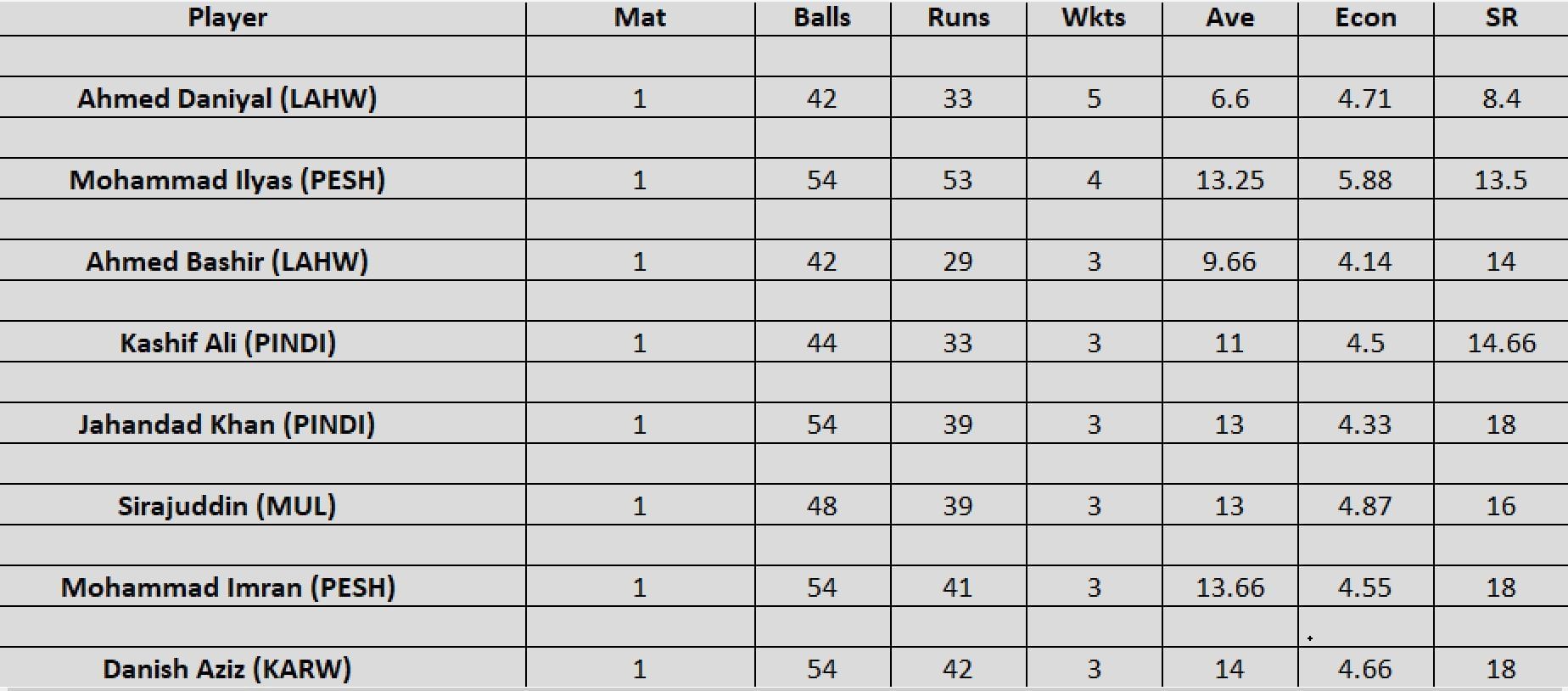Ahmed Bashir, Kashif Ali, Jahandad Khan, Sirajuddin, Mohammad Imran, Danish Aziz, and Khurram Shahzad have picked up three wickets apiece.