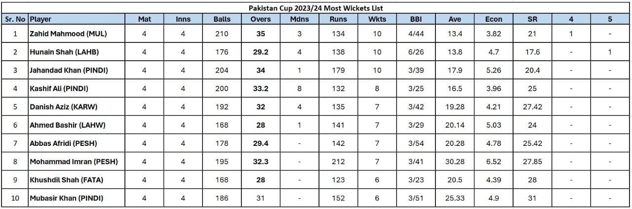 Kashif Ali of Rawalpindi has picked up eight wickets from four matches at an economy rate of 3.96. Danish Aziz, Ahmed Bashir, Abbas Afridi, and Mohammad Imran have taken seven wickets apiece.