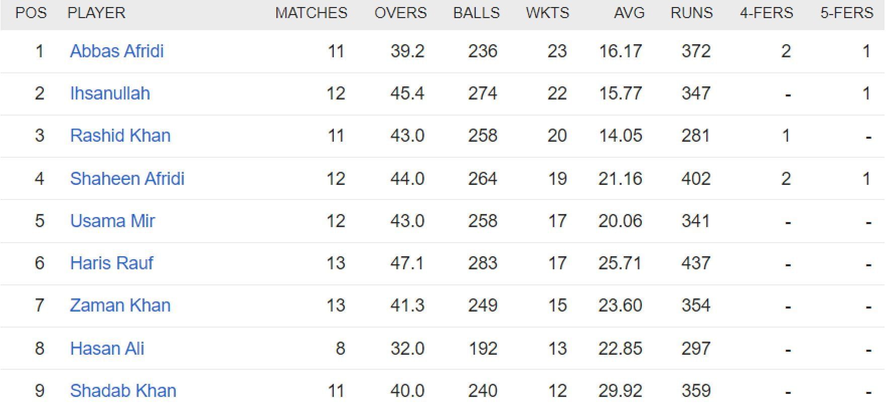 Rashid Khan of Lahore Qalandars joined the championship late, but finished as the third-highest wicket-taker. The leg-spinner accounted for 20 scalps from 11 matches. Shaheen Shah Afridi, fourth on the list, picked up 19 wickets from 12 matches.