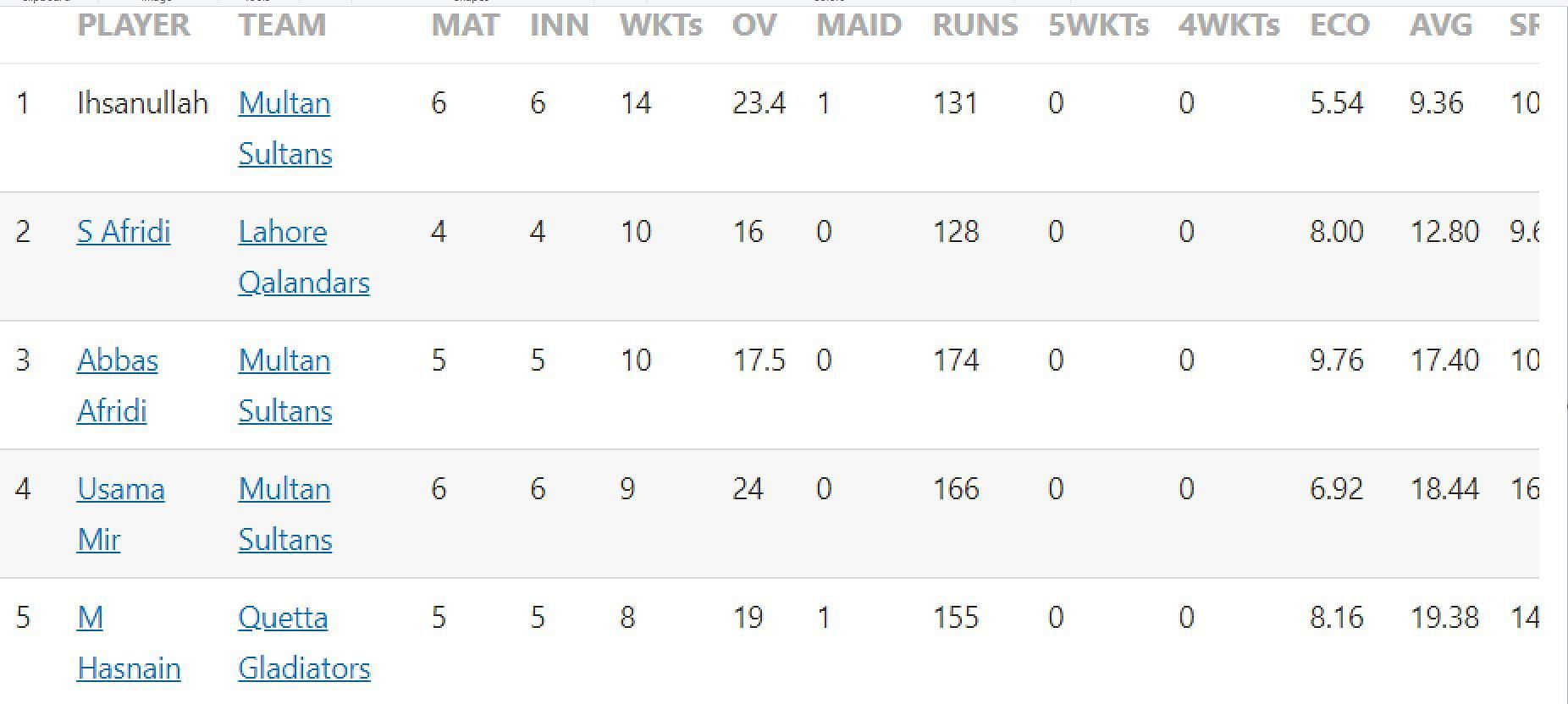 Sultans Abbas Afridi and Usama Mir have picked up 10 and nine wickets respectively. Mohammad Hasnain, Imad Wasim, and Akif Javed have also been among wickets.