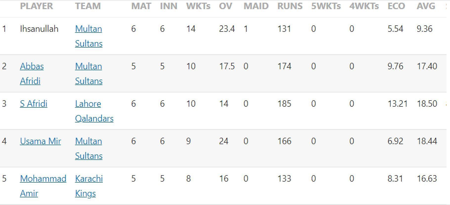 Abbas Afridi of the Sultans is second on the list with 10 scalps from five matches at an economy rate of 9.75. Shaheen Shah Afridi of the Qalandars also has 10 wickets to his name from five matches. He secured a five-wicket haul against Babar Azam’s Peshawar Zalmi.