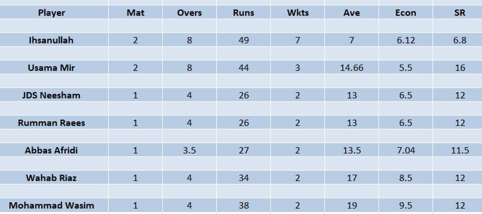 Usama Mir of the Sultans is the second-highest wicket-taker after he picked up three wickets from two games at an economy rate of 5.50.