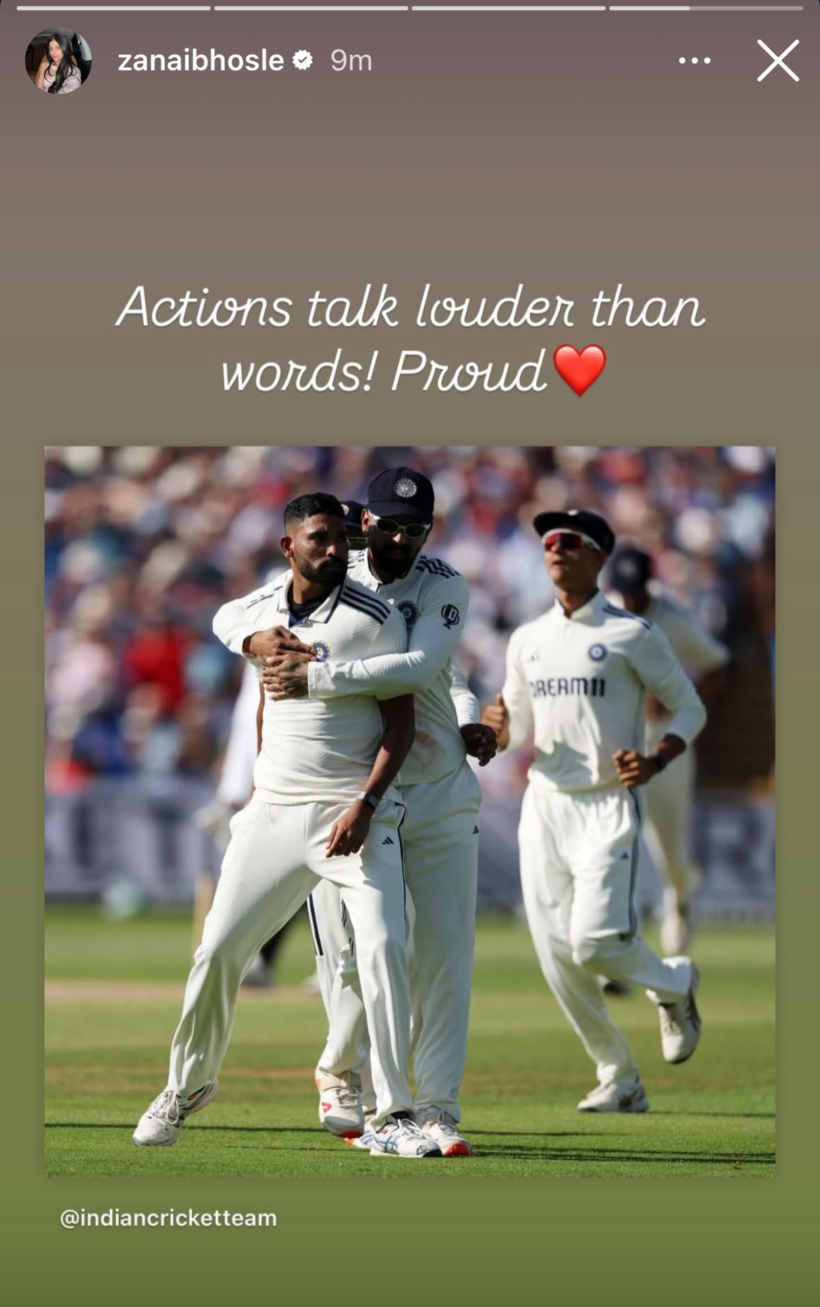 This was Siraj’s first wicket of the match. Reacting to the dismissal, singer Zanai Bhosle took to Instagram stories to share a message, writing: