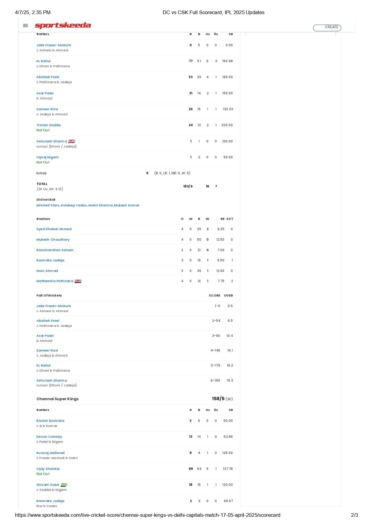 Batting first, DC posted 183/6 in 20 overs. KL Rahul starred with the bat, scoring 77 runs off 51 balls, comprising three sixes and six boundaries. Abishek Porel, skipper Axar Patel, and Sameer Rizvi chipped in with 33 (20), 21 (14), and 20 (15), respectively. Tristan Stubbs also scored an unbeaten 24 off 12 deliveries, comprising a six and two fours.