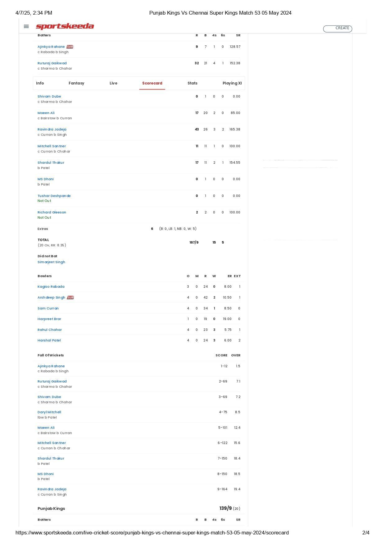 In their previous meeting, the Super Kings beat the Punjab Kings by 28 runs in match 53 of IPL 2024. Asked to bat first, CSK posted 167/9 in 20 overs. Skipper Ruturaj Gaikwad and Daryl Mitchell chipped in with 32 (21) and 30 (19), respectively.