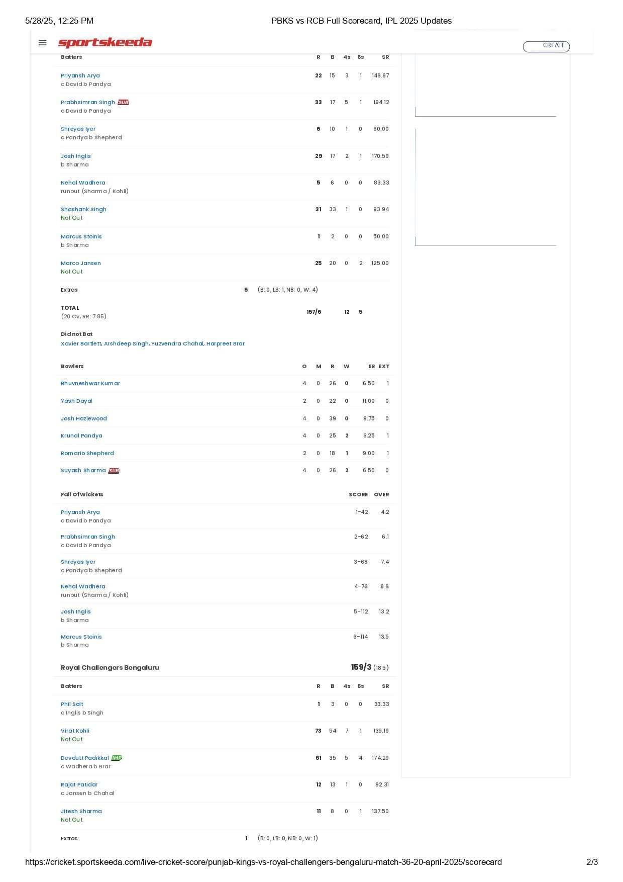 Asked to bat first, Punjab put up 157/6 in their allotted 20 overs. Openers Prabhsimran Singh and Priyansh Arya chipped in with 33 (17) and 22 (15), respectively. Skipper Shreyas Iyer and Nehal Wadhera then perished for single-digit scores. Later, Josh Inglish, Shashank Singh, and Marco Jansen contributed 29 (17), 31* (33), and 25* (20), respectively, to take their team to a par score.