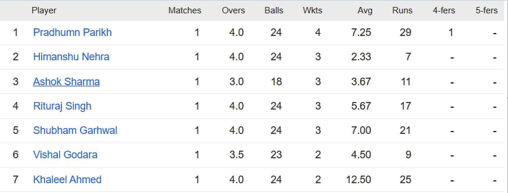 Ashok Sharma has picked up three wickets and is third in the list of leading wicket-takers. Rituraj Singh and Shubham Garhwal have also accounted for three scalps apiece.