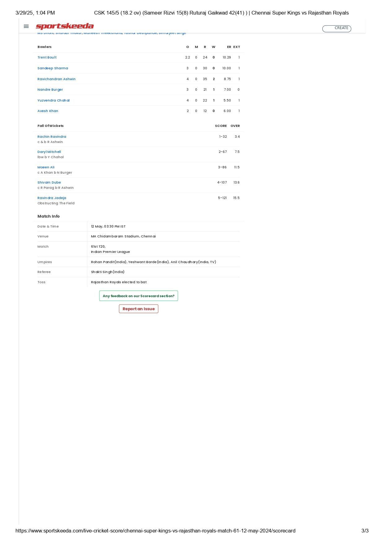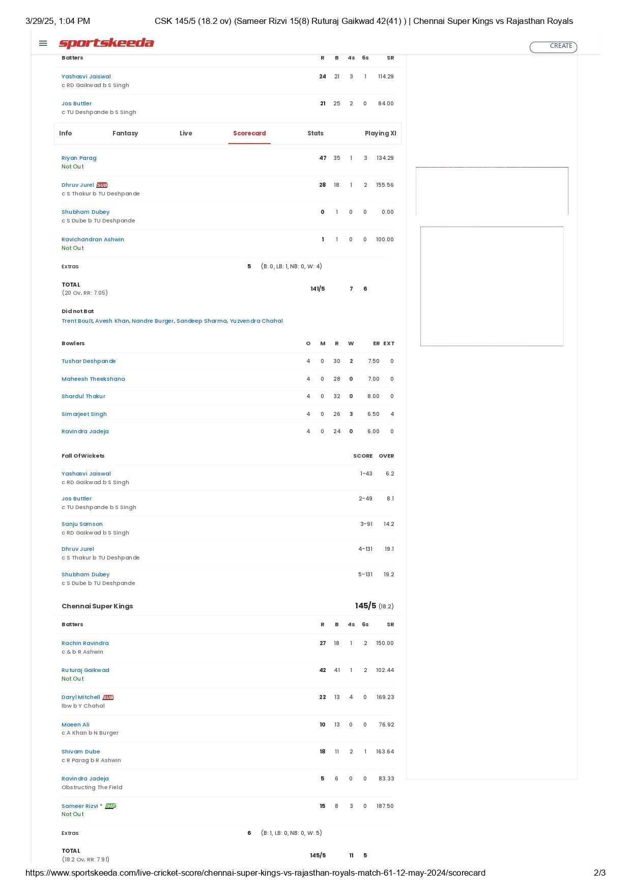 Invited to bat first, RR managed 151/9 in 20 overs. The top three failed to fire with Yashasvi Jaiswal (29 off 24), Sanju Samson (13 off 11), and stand-in captain Riyan Parag (25 off 15) being the key contributors. After the middle order suffered a collapse, Dhruv Jurel (33 off 28) and Jofra Archer (16 off 7) took the team past 150.