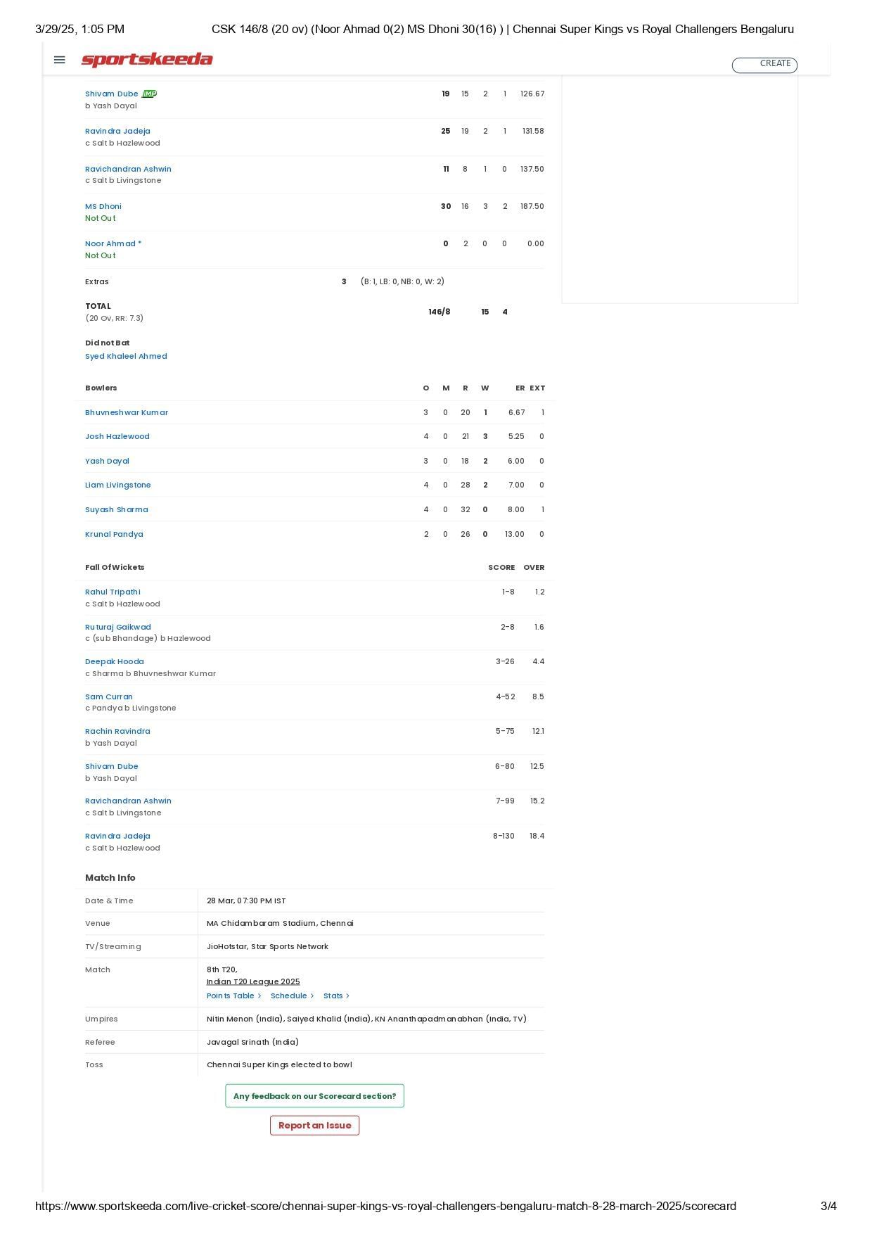 Walking in at no. 9, MS Dhoni entertained the crowd with an unbeaten 30 off 16 balls, hitting two sixes and three fours. Josh Hazlewood was the pick of the bowlers for RCB, finishing with exceptional figures of 3/21 in his four overs. Yash Dayal and Liam Livingstone bagged two wickets apiece.