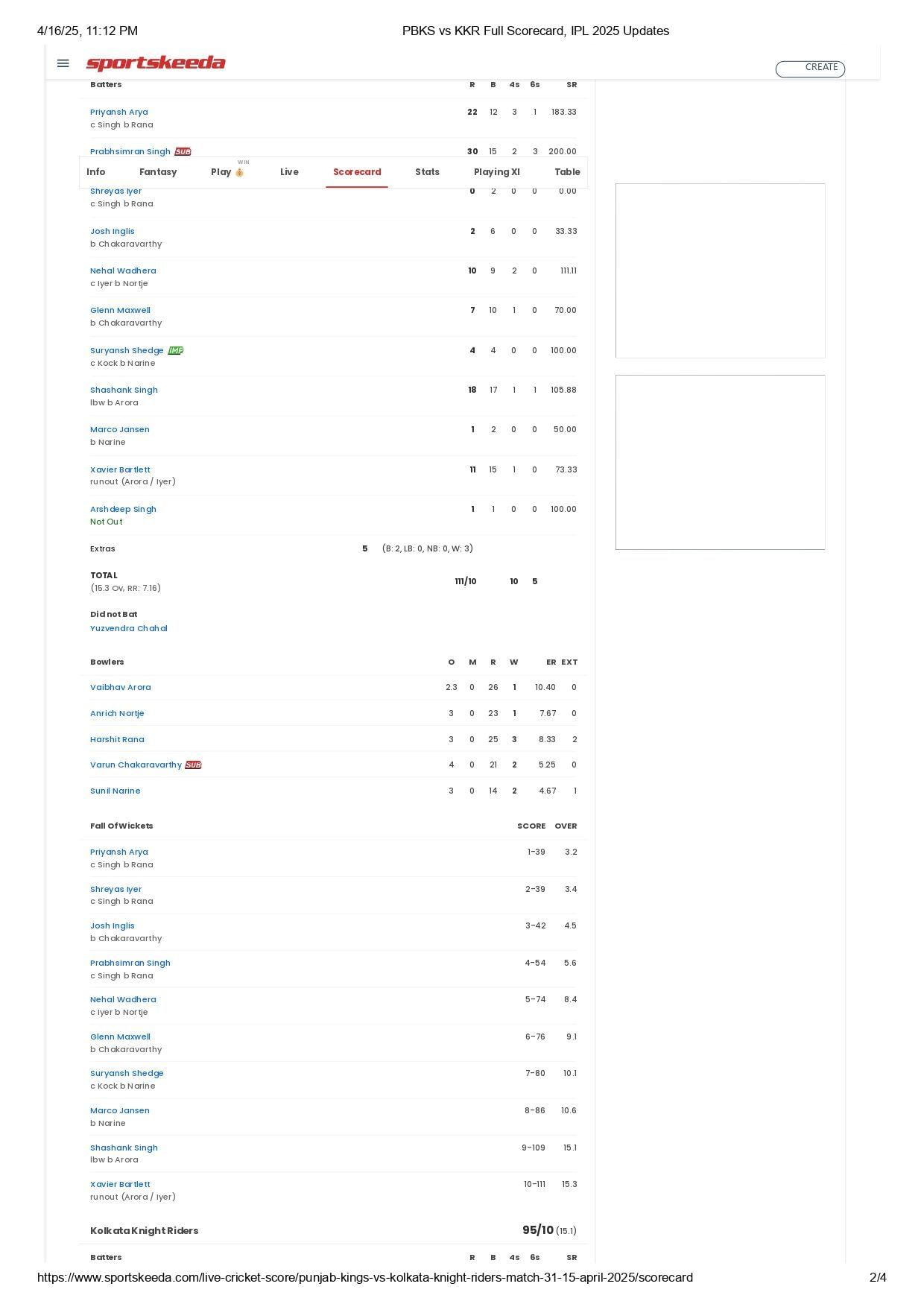 Battling first, PBKS were bundled out for 111 in 15.3 overs. Harshit Rana bagged three wickets, while Varun Chakaravarthy and Sunil Narine scalped two apiece.