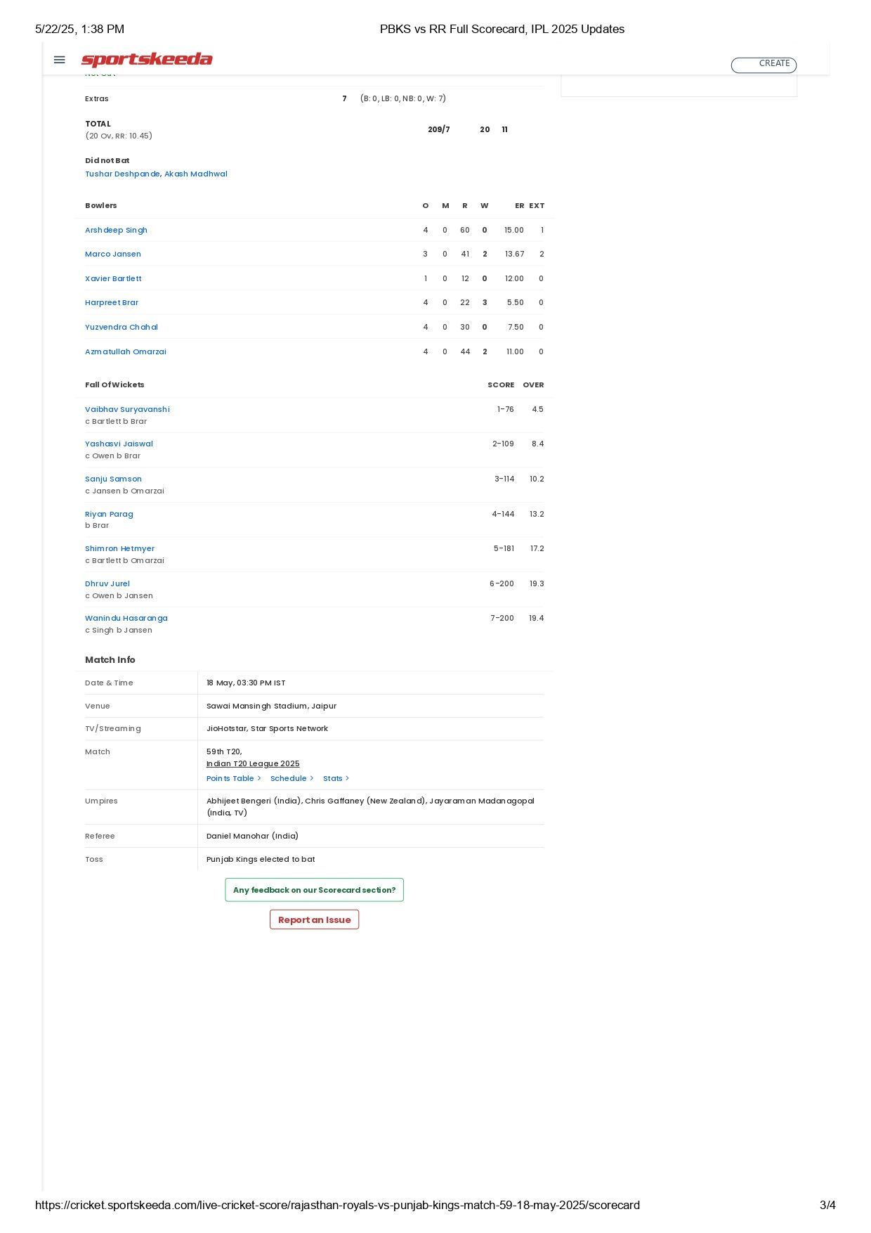Harpreet Brar was the pick of the lot for PBKS, returning with a spell of 3/22, while Marco Jansen and Azmatullah Omarzai took two wickets each.