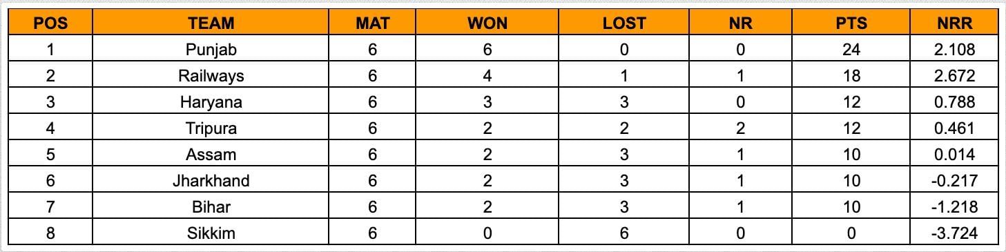 Starting with Group A, Punjab top the points table and have almost qualified for the knockouts. Railways and Haryana are looking for the second spot and one of the sides would be qualifying for the knockout stage.