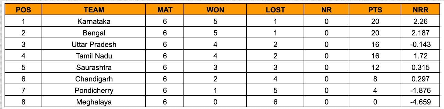 In Group B, the top four sides are still in contention for the top two knockout spots. Karnataka lead the standings with 20 points and a net run rate of 2.26. Bengal, UP, and Tamil Nadu are the next three ranked sides in the standings.