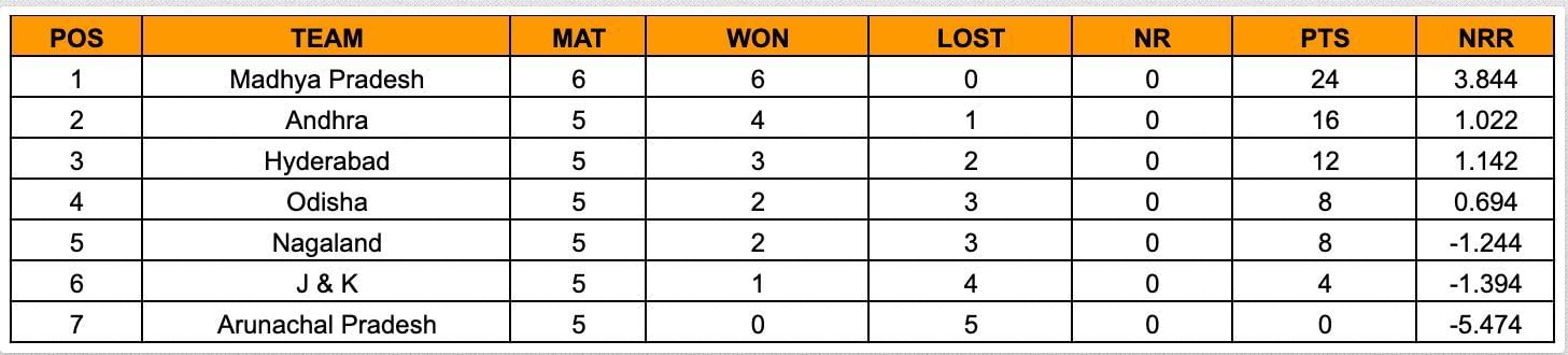 In Group E, MP is leading the standings with 24 points from six matches. Andhra Pradesh and Hyderabad have a good chance of making it to the next stage by winning their next games.