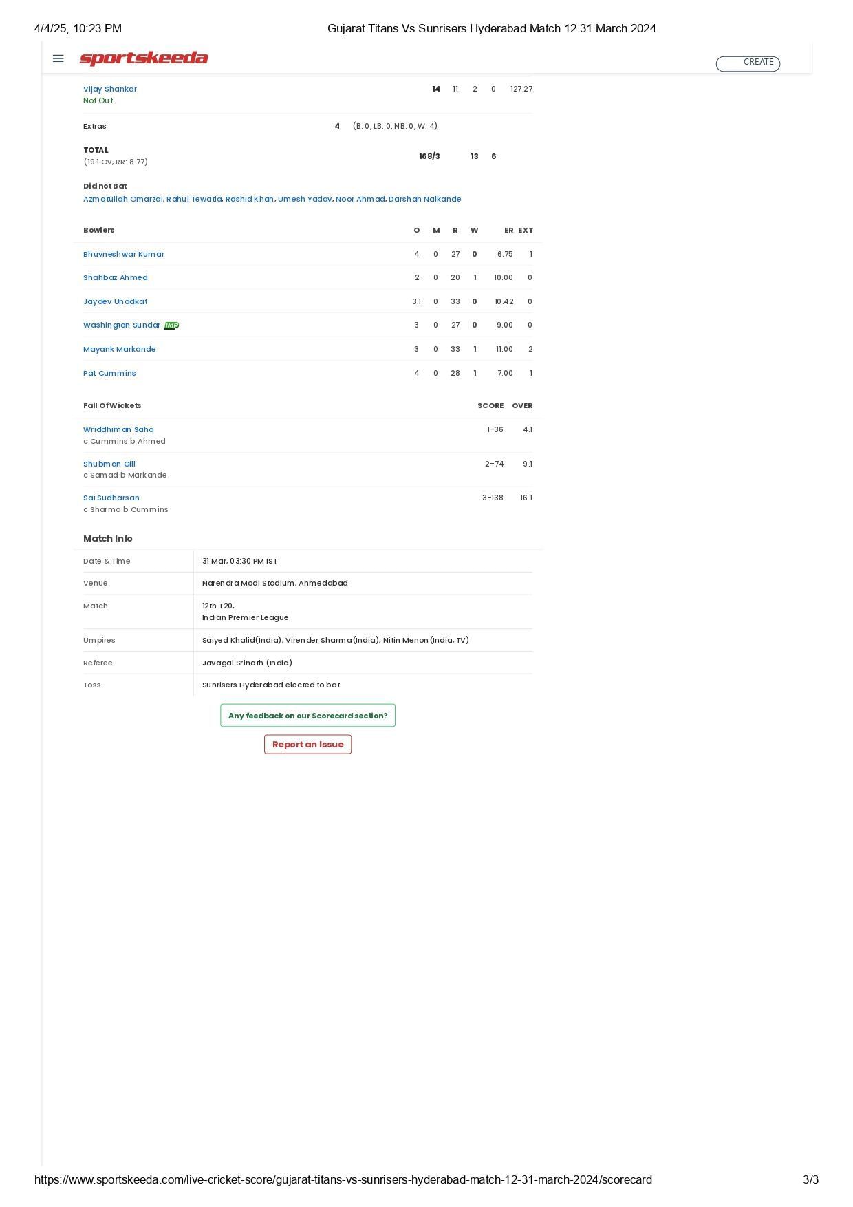 Mohit Sharma starred with the ball for the Titans, returning with figures of 3/25 in his four overs. Meanwhile, Azmatullah Omarzai, Umesh Yadav, Rashid Khan and Noor Ahmad bagged one wicket apiece.