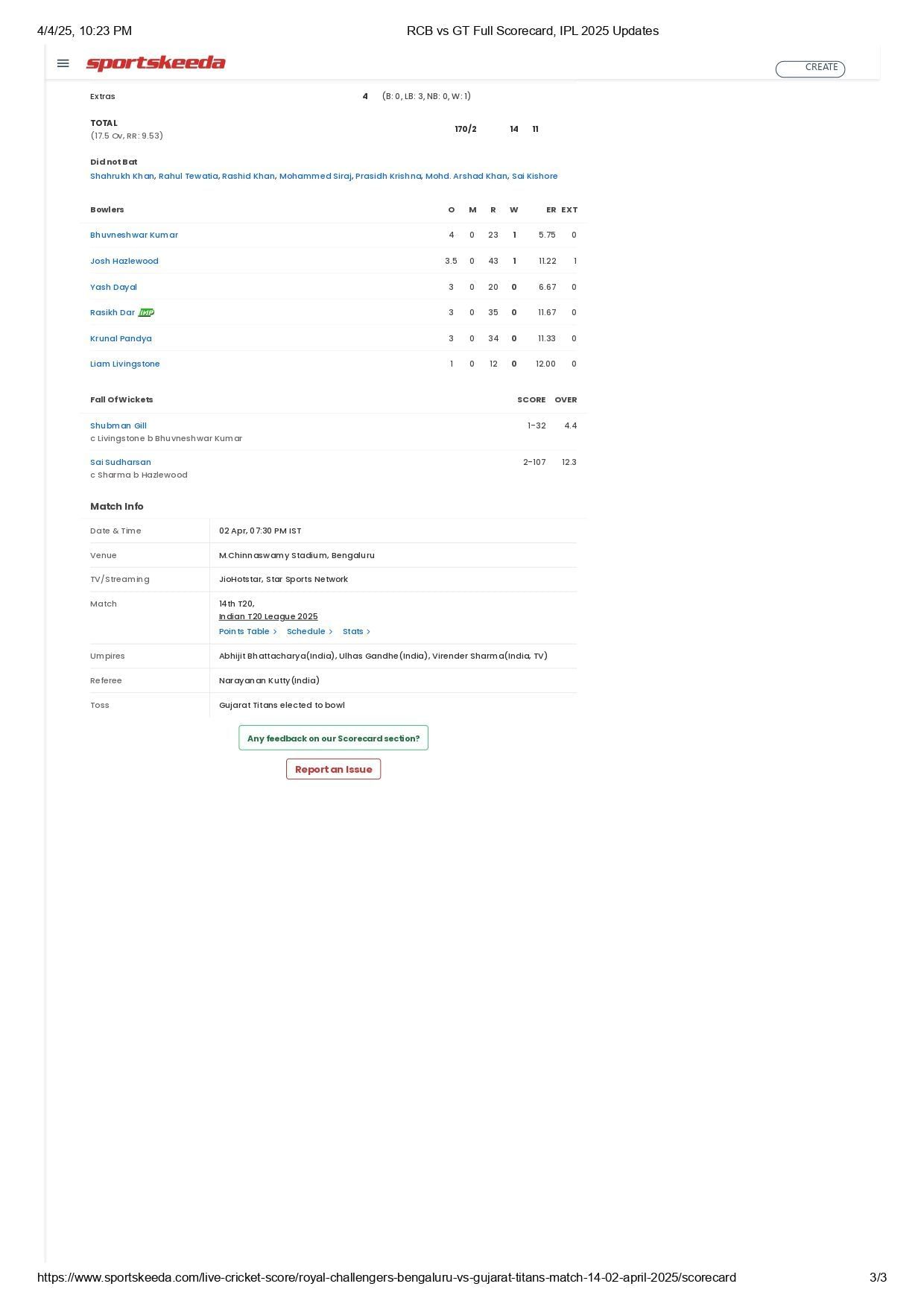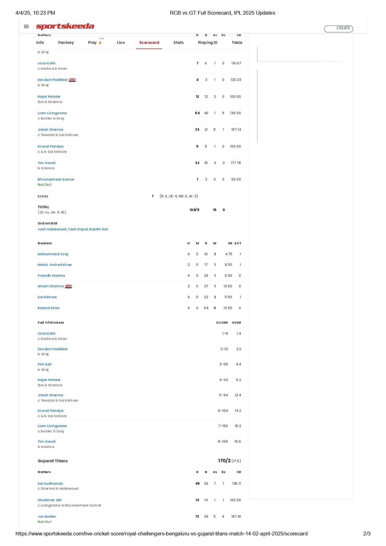 Asked to bat first, RCB put up 169/8 in 20 overs. The top four failed miserably with Phil Salt, Virat Kohli, Devdutt Padikkal, and skipper Rajat Patidar returning with scores of 14 (13), 7 (6), 4(3), and a run-a-ball 12, respectively. Liam Livingstone delivered with the bat, smashing a quickfire 54 off 40 deliveries, in an innings laced with five maximums and one boundary. Meanwhile, Jitesh Sharma and Tim David chipped in with 33 (21) and 32 (18), respectively.