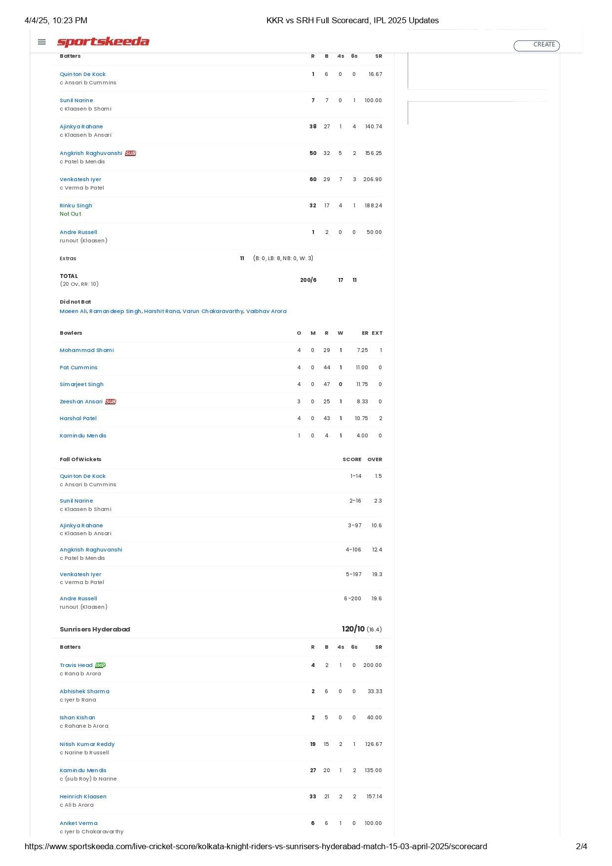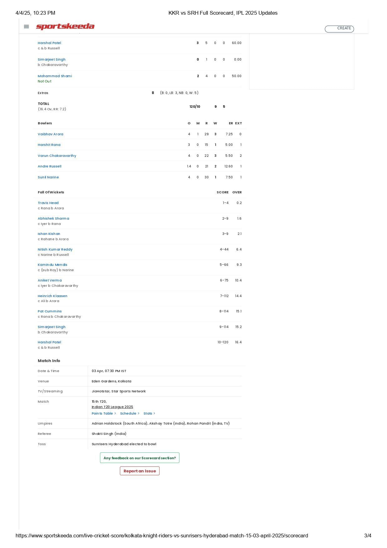 In response, the SunRisers were bundled out for 120 in 16.4 overs. The top three – Travis Head, Abhishek Sharma, and Ishan Kishan departed for single digits. Heinrich Klaasen, Kamindu Mendis, Nitish Reddy, and Cummins contributed 33 (21), 27 (20), 19 (15), and 14 (15), respectively, to help the team reach triple figures.