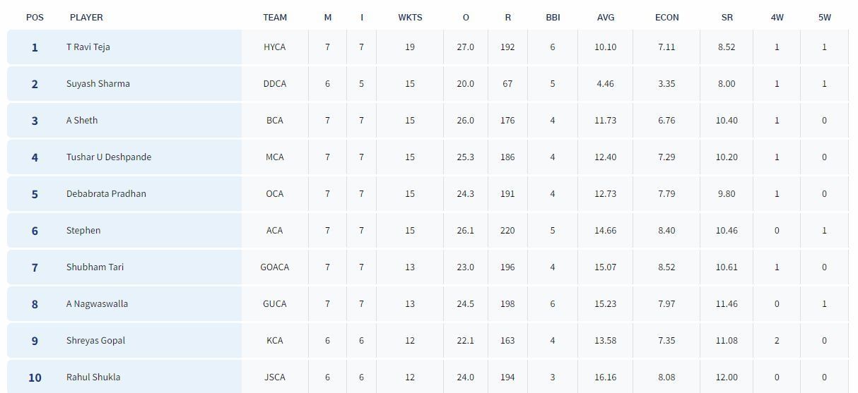 Baroda medium pacer Atit Sheth moved up to occupy the third rank with 15 scalps from seven innings.