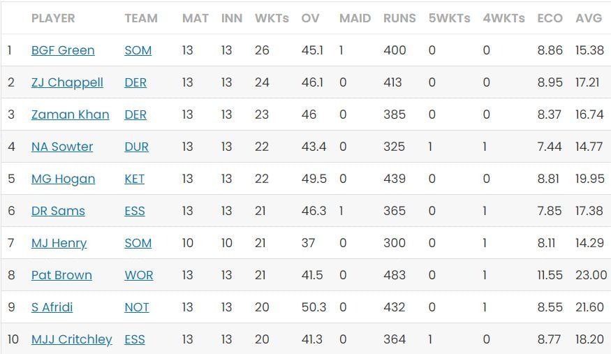 As far as bowling charts are concerned, Ben Green of Somerset enjoys the top spot with 25 wickets from 12 matches. He could only pick up a wicket against Surrey.