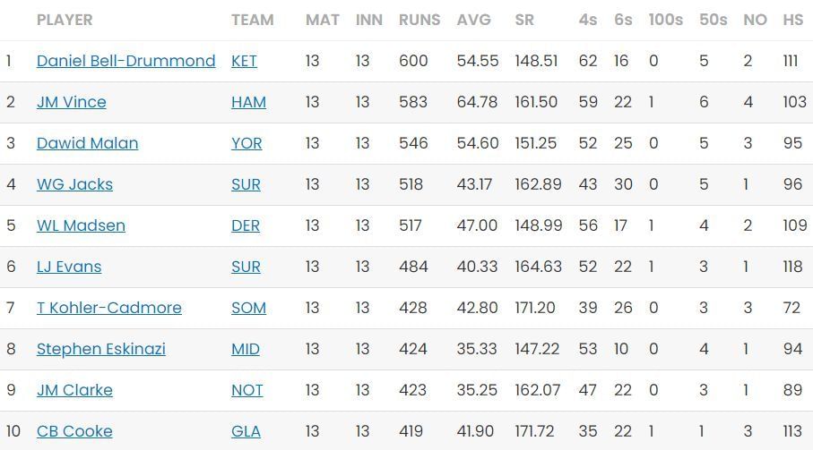Bell Drummond leads the batting charts in T20 Blast 2023