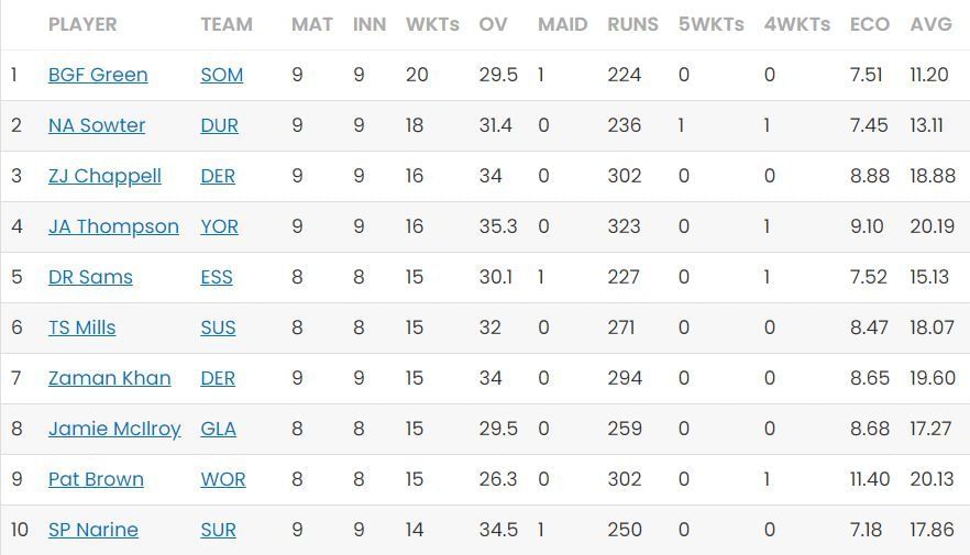 Jordan Thompson of Yorkshire is in third place. He picked a single against Leicestershire and has 16 wickets in nine games.