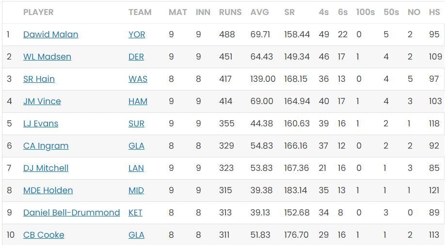 Dawid Malan has risen to the top slot after a magnificent knock of 79 against Leicestershire. He has 488 runs at an average of 69.71 in nine games.