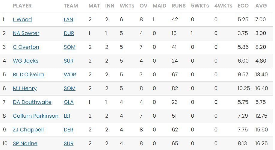 Luke Wood from Lancashire continues to dominate as the leading wicket-taker, having taken six wickets from two matches with an impressive average of seven. Wood's consistent ability to secure crucial wickets has been instrumental in his team's success.