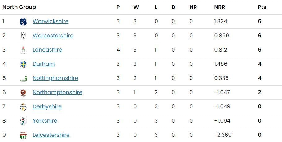 Lancashire, despite having six points, now possesses a net run rate of 0.812. Worcestershire, another undefeated team in the group, hold the second position with six points and a net run rate of 0.859.