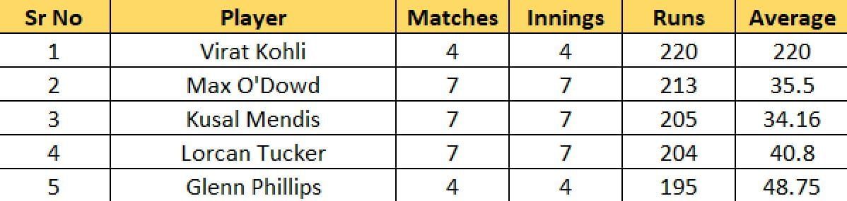 Glenn Phillips of New Zealand scored 17 against Ireland and has jumped to the fifth spot. He has 195 runs to his name in four games and will play a crucial role for his side in the semi-finals.