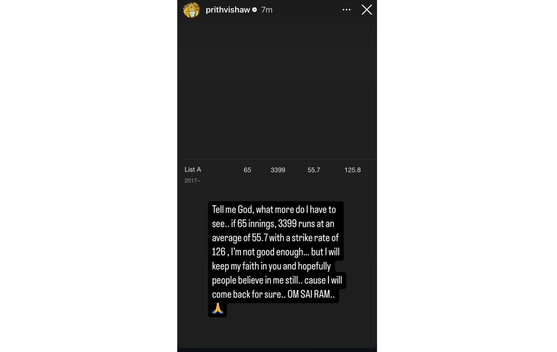 Shaw posted an Instagram story to point out that he has scored 3,399 runs from 65 innings at an average of 55.7. He emphasized that despite the setback, he has faith in God and would definitely make a strong comeback.