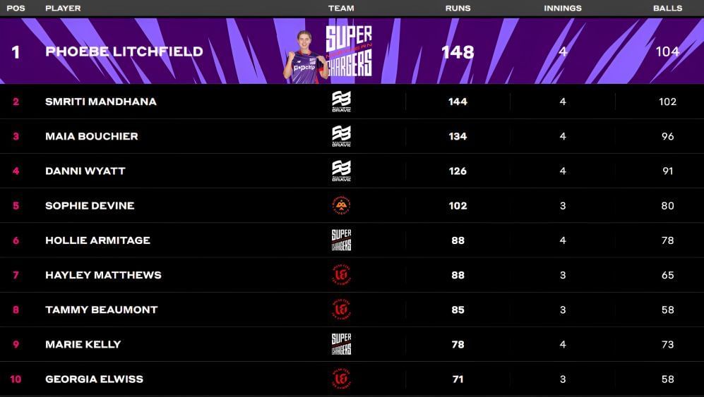 The Indian batter has 144 runs from four games and is replaced by Litchfield at the top after the Northern Superchargers’ sensation's promising inning of 68 runs in her latest appearance. She now has 148 runs from four matches, which means that Mandhana and Litchfield only share a slight difference in their stats.