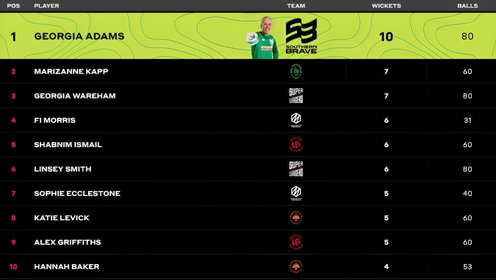 Next is Oval Invincibles’ Marizanne Kapp with seven wickets from three matches. Whereas, Superchargers’ Georgia Wareham is sitting in third place. She enjoys as many wickets as Kapp from four matches but a slightly higher average and economy.