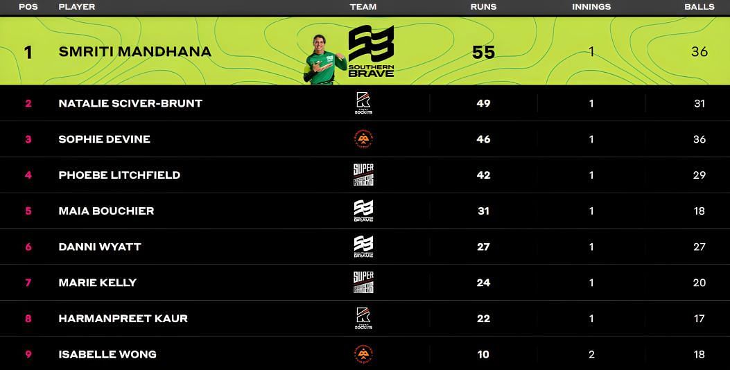 Brave's Danni Wyatt sits in the second position with 114 runs from three matches. For the third place, Phoenix’s Devine has replaced Maia Bouchier, as the former has now scored 73 runs in two matches.