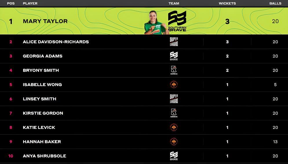 Originals bowlers' dominating performances on Day 7 saw them rise in the ranks. Fi Morris, after a fifer, is now sitting in second place with five wickets from a single appearance.