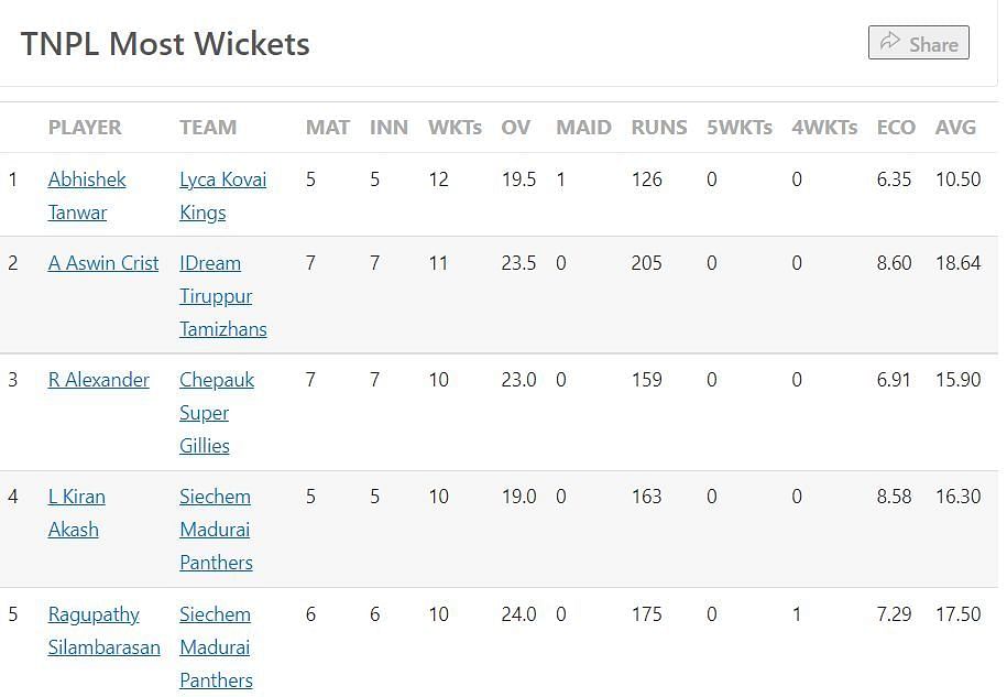 Alexander picked up two wickets giving away only 25 runs in his four overs and has helped his side qualify for the playoffs. He has jumped to the third spot in the most wickets list. L Kiran Akash and Ragupathy Silambarasan also have 10 points and are placed fourth and fifth, respectively, in the most wickets list of TNPL 2022.