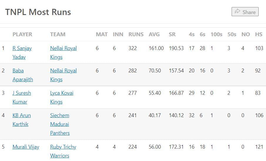 If they are to qualify for the knockout stages of the competition, a lot will rely on how Kumar contributes in their game against the Nellai Royal Kings. Arun Karthik and Murali Vijay sit below Kumar in the list with 241 and 224 runs, respectively.